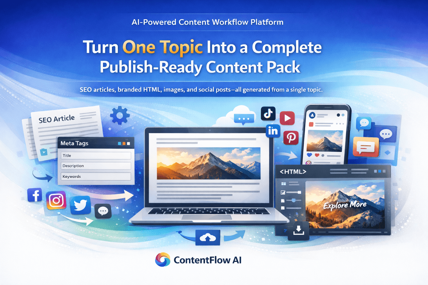 ContentFlow AI helps creators, marketers, and brands transform a single topic into SEO-ready articles, branded HTML, image prompts, visuals, and platform-specific social posts from one connected workflow.